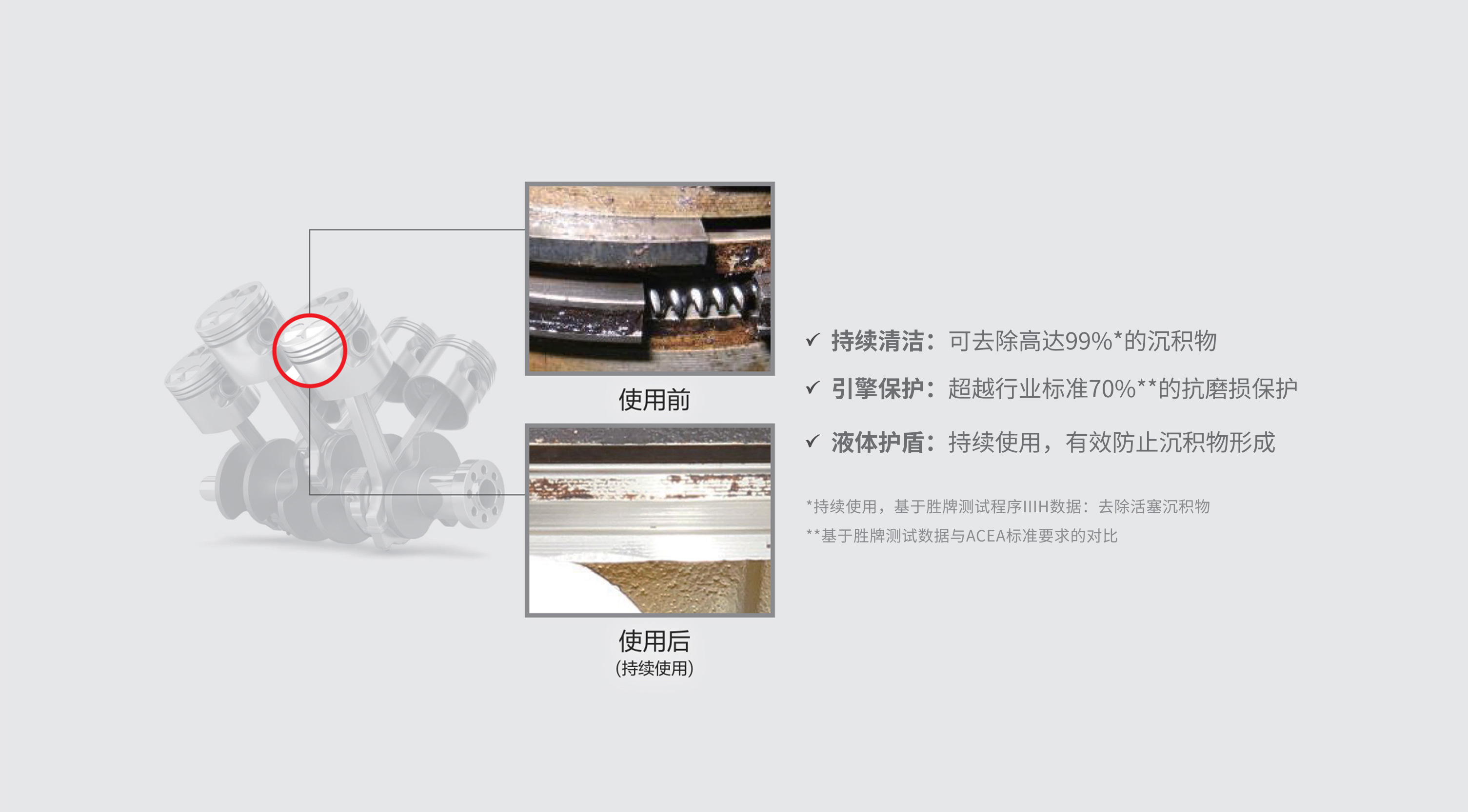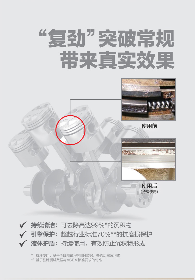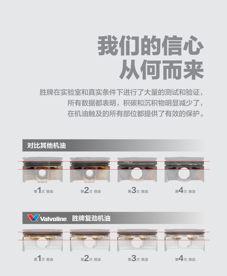勝牌在實(shí)驗(yàn)室和真實(shí)條件下進(jìn)行了大量的測試和驗(yàn)證,所有數(shù)據(jù)都表明,積碳和沉積物明顯減少了,在機(jī)油觸及的所有部位都提供了有效的保護(hù)。